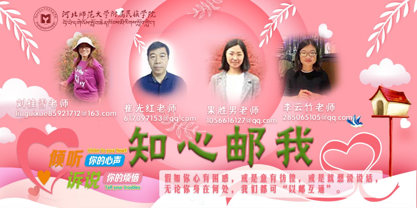 疫情当下,学院暂缓学生返校,同学们都通过网课进行学习。为帮助有需要的同学及时疏导心理,特邀beat365心理专业教师,组建了知心天团,开展“知心邮我”心理帮扶活动。如有需要可以通过电子邮件与老师沟通咨询,老师们将竭尽全力为同学们提供心理方面专业的咨询和帮助。