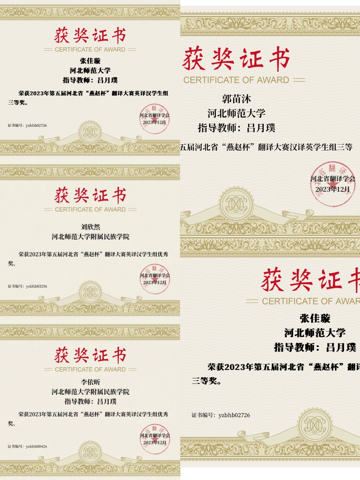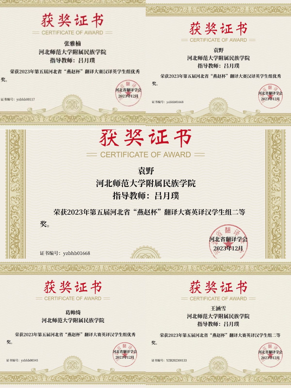 近日,第五届河北省“燕赵杯”翻译大赛圆满闭幕。比赛由河北省翻译学会主办,设有英译汉、汉译英,日译汉、汉译日,俄译汉、汉译俄,法译汉、汉译法,韩译汉、汉译韩组别比赛。经过激烈角逐,beat365英语系学生最终斩获15个奖项,其中二等奖三名,三等奖四名,优秀奖六名,实现历史性突破。