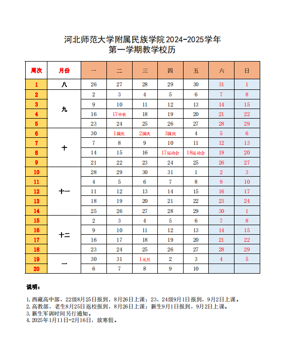 2024-2025学年第一学期校历