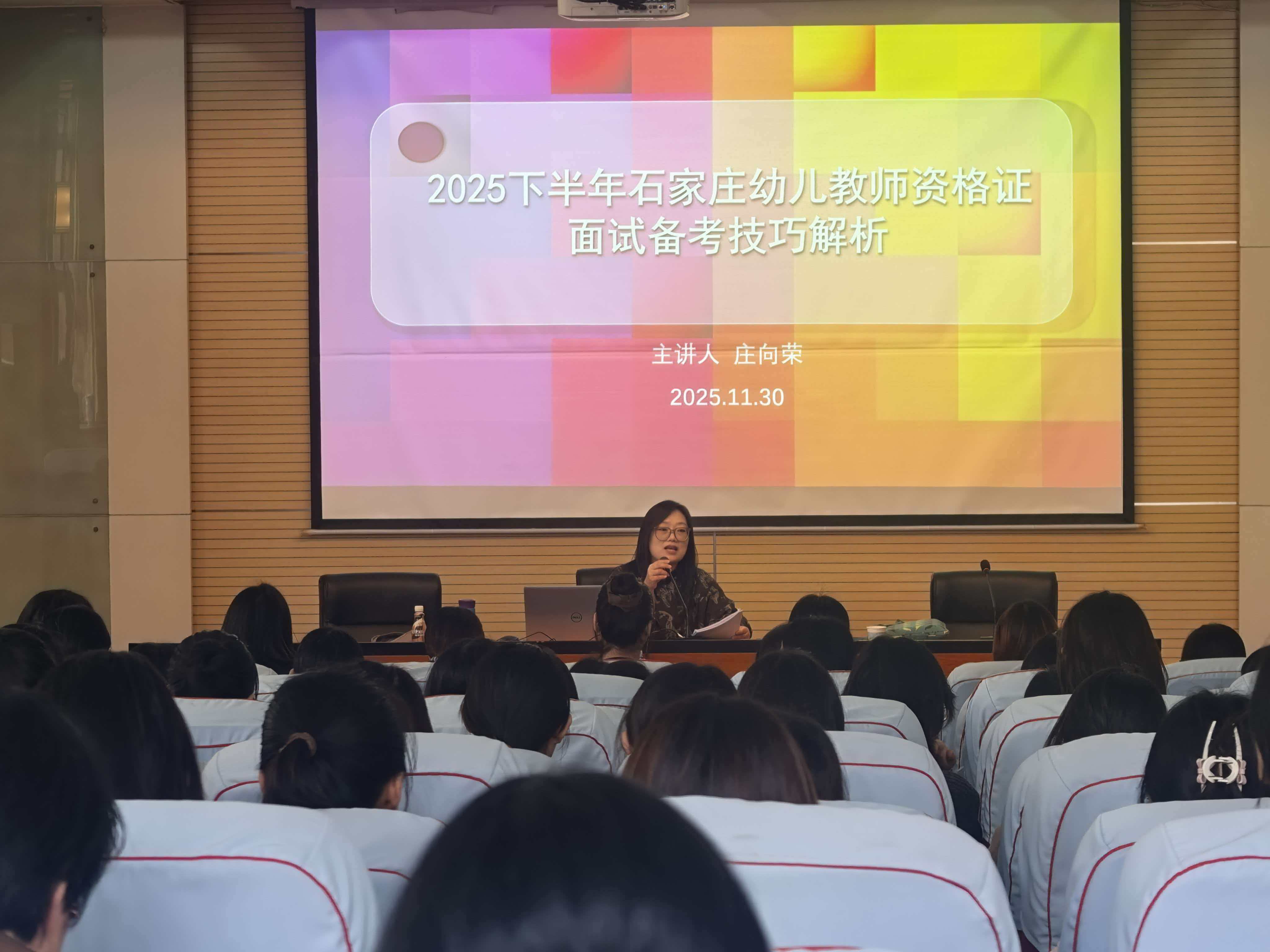 为有效提升学生参加教师资格证国考面试的能力,助力2021级学前教育专业学生顺利迈入幼教岗位,基础教育系于11月30日举办幼儿园教师面试专项培训活动。本次活动特邀石家庄市桥西区第三幼儿园书记、园长、高级教师庄向荣担任主讲,为该专业全体学生提供专业面试指导,切实筑牢面试备考基础。
