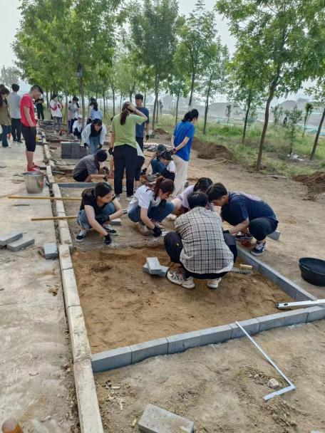 19级风景园林班25人,分为3组,21风景园林专接本17人,分为2组,对8号楼后进行园路铺装,首先进行清理场地,之后试拼图案,定点放线,准备路槽,安装道牙,对场地找平夯实,铺筑水泥砂浆结合层,对面层进行铺筑,最后进行压平、扫缝。用时两天半,同学们克服炎热的天气,勤劳苦干,细致耐心,在翟美珠老师的指导和帮助下顺利完成了铺装实训。