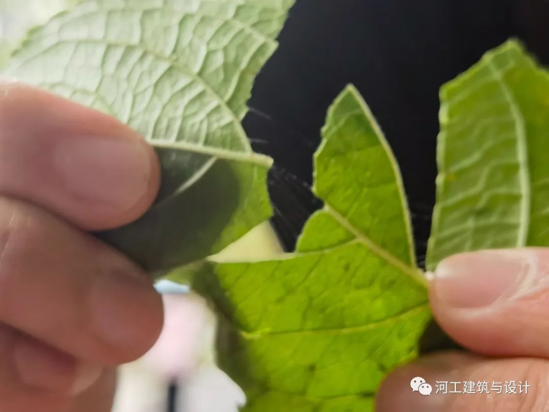 同学听取了赵丽娜老师对“杜仲”的讲解对其叶片进行观察,实践后发现杜仲叶子在撕扯后会产生白色的细丝,是由于其内含有橡胶成分,并对这一识别特征进行记录。