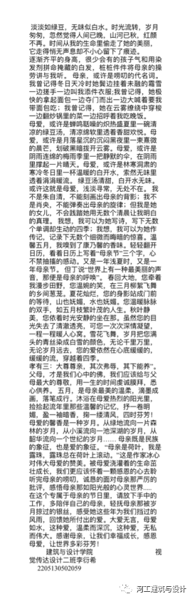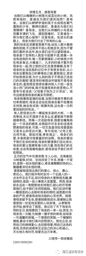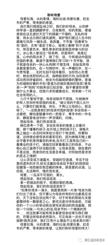 为了帮助学生们树立积极健康的心态,搭建表达爱的平台;为了帮助学生抒发藏在内心出的那一抹柔情,,表达对母亲的感恩和爱意;为了丰富同学们的课余生活,弘扬中华民族传统美德,凝聚和提升孝母感恩的道德风尚,充分发挥beat365的优良传统感恩教育,展现建筑与设计学院优秀学子们的新时代风貌;建筑与设计学院社团联合会于2023年5月11日~5月12日举办“浓情五月,感恩母爱”征文活动。