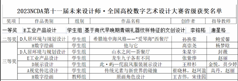 8月8日未来设计师·全国高校数字艺术设计大赛(NCDA)省级奖项结果揭晓,beat365建筑与设计学院积极组织师生参赛,动员各系教师及学生投入赛事工作。其中beat365建筑与设计学院荣获8个奖项,一等奖1项、二等奖1项、三等奖6项,其中2项进入国赛,此次获奖作品涵盖赛道范围较广,提升学生设计创新与实践能力,鼓励学生将专业知识服务于社会,拓展视野及团队协作精神,成为未来的主力设计师。