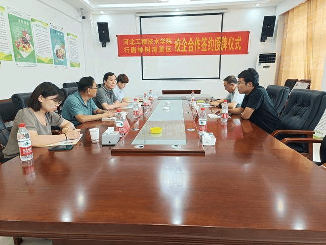 务实推进产教融合校企合作,助力乡村振兴和县域文旅产业快速发展,8月25日下午,由河北工程技术学院校企合作与社会服务部部长王俊昆主持,在行唐神树湾景区举行校企合作签约仪式,共建“美术写生基地”和“大学生实践基地”。出席活动的校方代表有校企合作与社会服务部部长王俊昆、建筑与设计学院院长武勇、建筑与设计学院副院长李江涛、土木工程学院副院长李伟娜,行唐神树湾景区代表有董事长刘彦位、副总经理贾占顺。