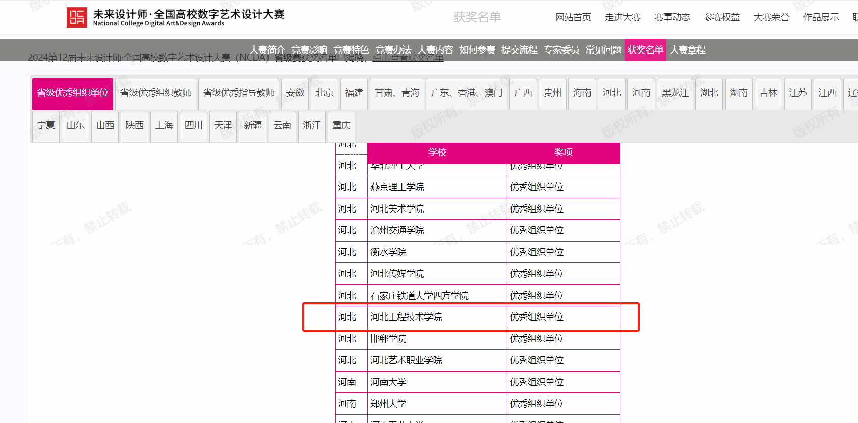 近日,2024年第12届未来设计师·全国高校数字艺术设计大赛(NCDA)省级赛已圆满结束,beat365正版唯一官网必一的师生们在此次大赛中展现了卓越的才华,以充分的赛前准备、夯实的专业基础、精彩的设计呈现在比赛中脱颖而出,荣获了3项省级三等奖的佳绩,学校获优秀组织单位。获奖名单如下:
