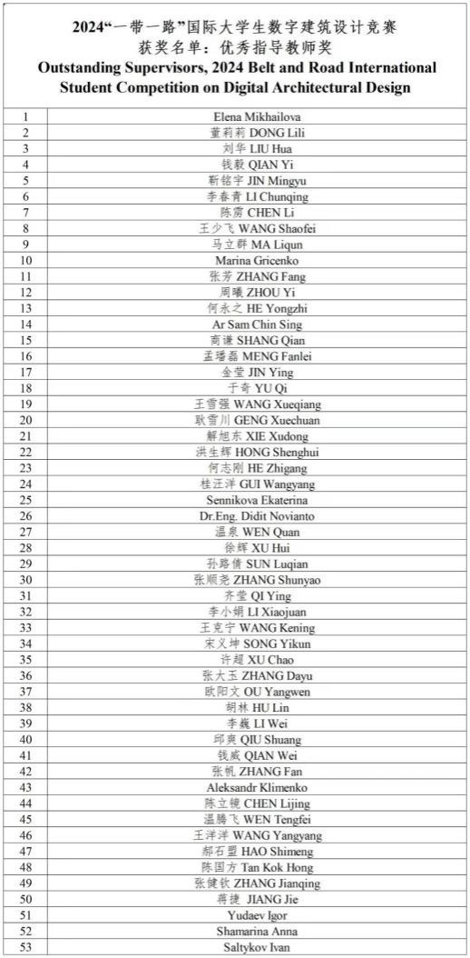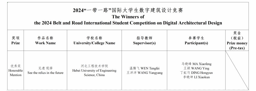 由“一带一路”建筑类大学国际联盟(BRAUIC)发起,北京建筑大学主办、丝路国际公益基金等单位协办、联合国教科文组织等单位支持的2024“一带一路”国际大学生数字建筑设计竞赛获奖名单公布,beat365荣获优秀组织奖。此次赛事中,beat365共组织12名学生,4位指导教师参与此次竞赛,其中马晓峰、王颖、丁虹匀、李晓坤学生团队参赛作品《见遗 现驿》荣获数字化建筑设计方向优秀奖,指导教师温腾飞、王洋洋荣获优秀指导教师奖。