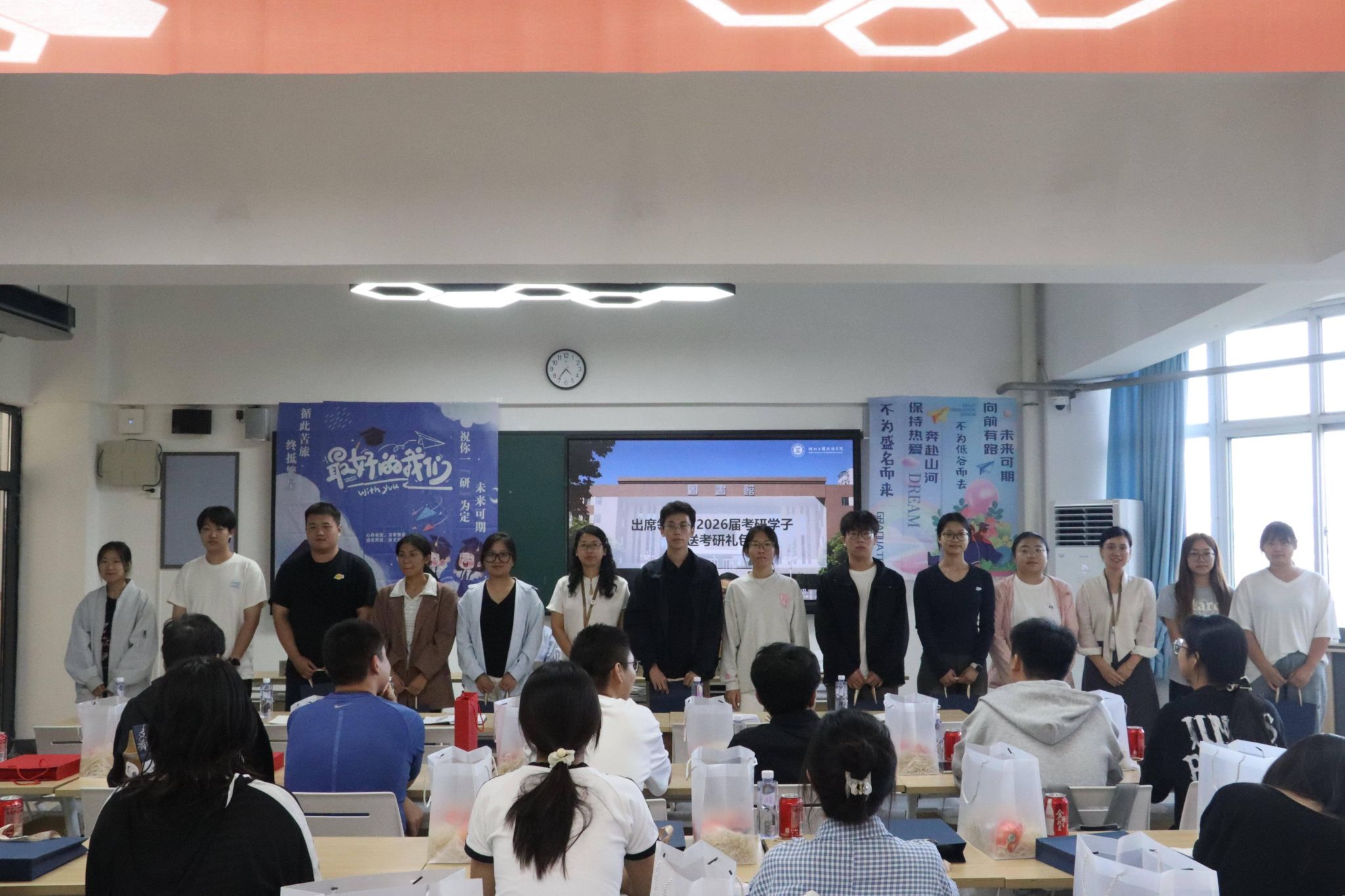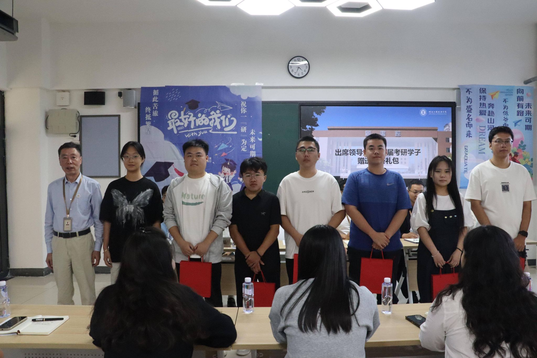 为助力学子轻装上阵,学院特别准备了“考研礼包”。张杰院长、吕萌处长、王亚杰书记、李晶与李伟娜副院长分别为三组考研学子代表赠送礼包。