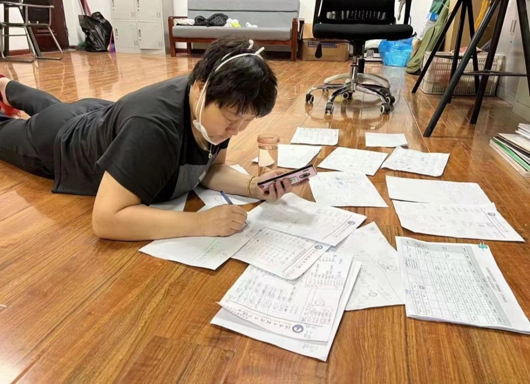 她在六天时间里,细致的安排学校的防疫管理工作,并悉心安慰抗原、核酸结果异常的同学,安抚家长情绪。她同时协调着学校志愿服务的调度与安排。在这六天时间里,她承受着巨大的压力和责任。一日三餐不足、睡眠不足,使她腰间盘突出的旧疾复发。而病发之时,张玲玲院长并没有离开岗位,而是坚守一线、迎难而上,将各种资料铺在地板上工作,坚持工作,只为同学们在疫情来临时能够安全安稳。张院长全身心的投入到这场“无声的战斗”中,时时为学生着想,处处把学生牵挂,促进了学校防控期间和谐、稳定,保证了防控工作的顺利展开。