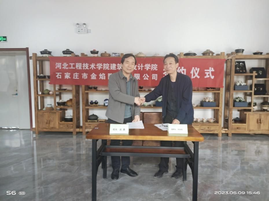 2023年 5月9日下午,建筑与设计学院与石家庄市金焰陶瓷有限公司院长武勇,建筑与设计学院学管副院长、党支部书记张玲玲,建筑与设计学院副院长谷雨,建筑与设计学院副院长李江涛带领办公室主任王海波,实践教学中心主任徐长贵,艺术设计学专职教师刘鶄燕、郭晓颖前往石家庄市金焰陶瓷有限公司参观洽谈,达成校企合作意向,并举行了签约仪式。
