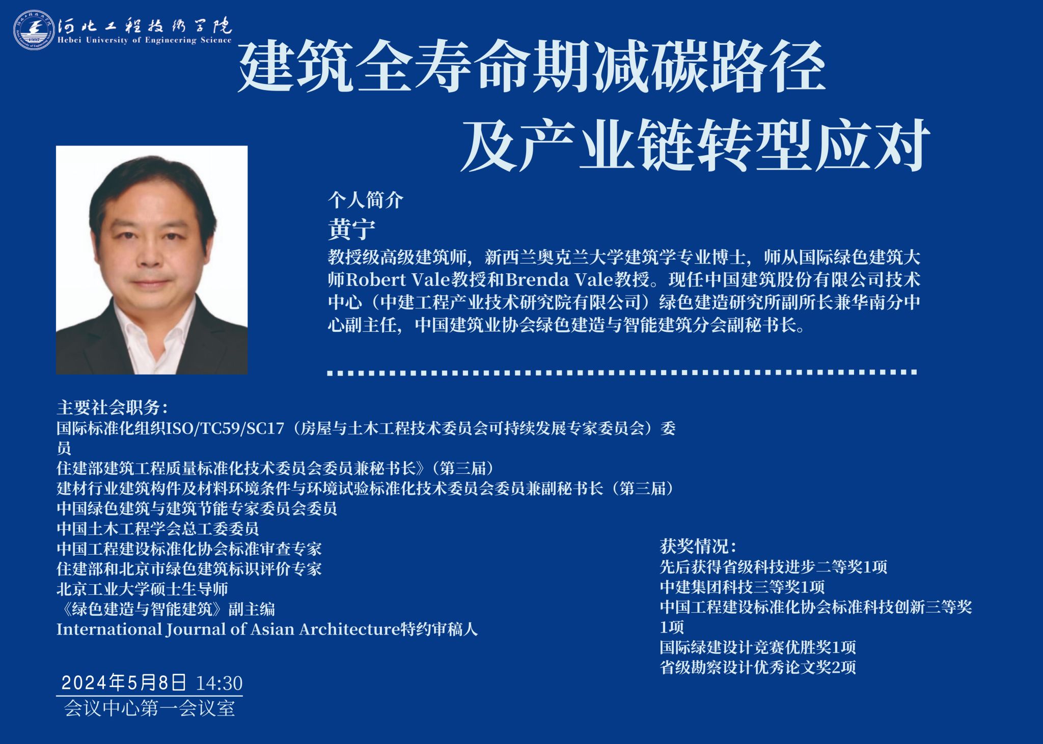 主讲人简介:黄宁,男,教授级高级建筑师。新西兰奥克兰大学建筑学专业博士,师从国际绿色建筑大师Robert Vale教授和Brenda Vale教授。现任中国建筑股份有限公司技术中心(中建工程产业技术研究院有限公司)绿色建造研究所副所长兼华南分中心副主任、中国建筑业协会绿色建造与智能建筑分会副秘书长。