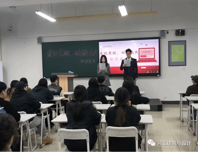 建筑与设计学院社团联合会于2023年3月24日下午18:00分别在主教418和407举办“爱校荣校,砥砺成长”知识竞赛活动,比赛分为初赛和决赛两个阶段,决赛在418举行。