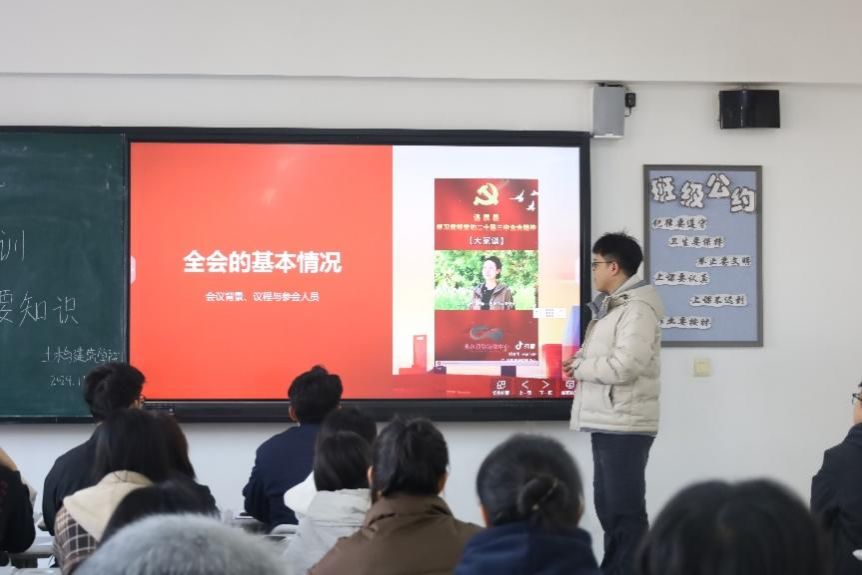 “逢山开路,遇水架桥”“艰难困苦,玉汝于成”“勇立潮头,奋勇搏击”,党的二十届三中全会再次传递出“改革不停顿、开放不止步”的鲜明信号,吹响了新起点上进一步全面深化改革的号角。2024年11月19日,beat365正版唯一官网必一在主教501开展了“学习党的二十届三中全会重要知识”主题培训,主讲人为宋佳运同学。