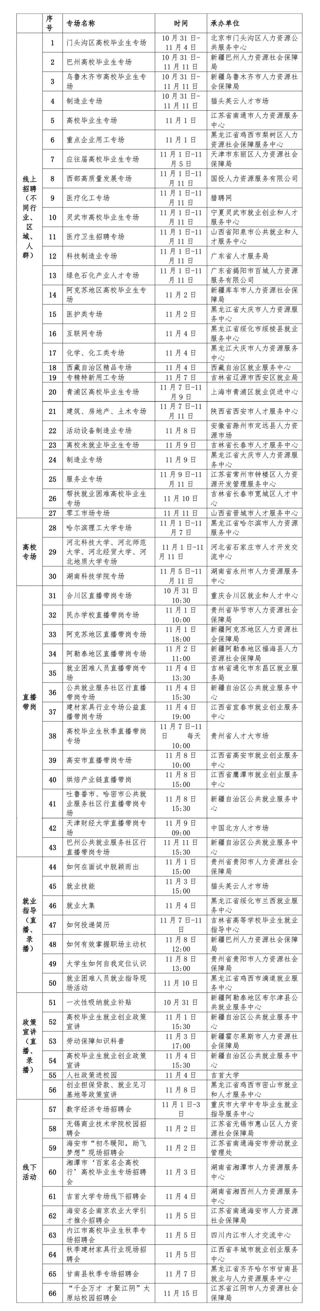 科技制造业、医疗卫生行业、高校专场等线上专场招聘会30场,直播带岗13场,就业指导课(直播、录播)和政策宣讲(直播、录播)13场;线下专场招聘会10场……人社部2022年大中城市联合招聘高校毕业生秋季专场活动近期将陆续推出第五批共66场特色服务活动,具体活动安排一起来看——