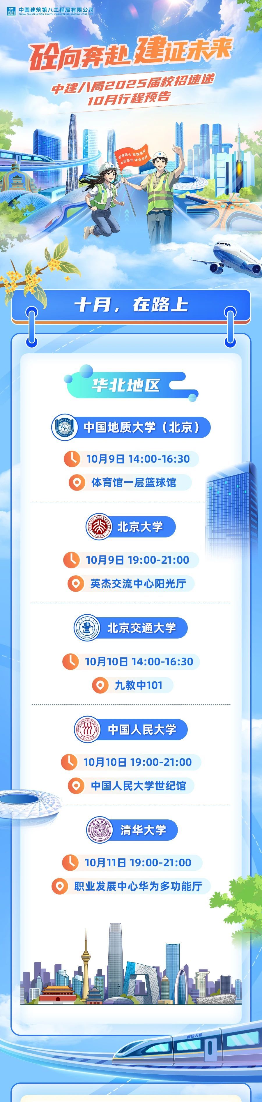 「招聘公告」中建八局2025届校招速递!10月行程预告