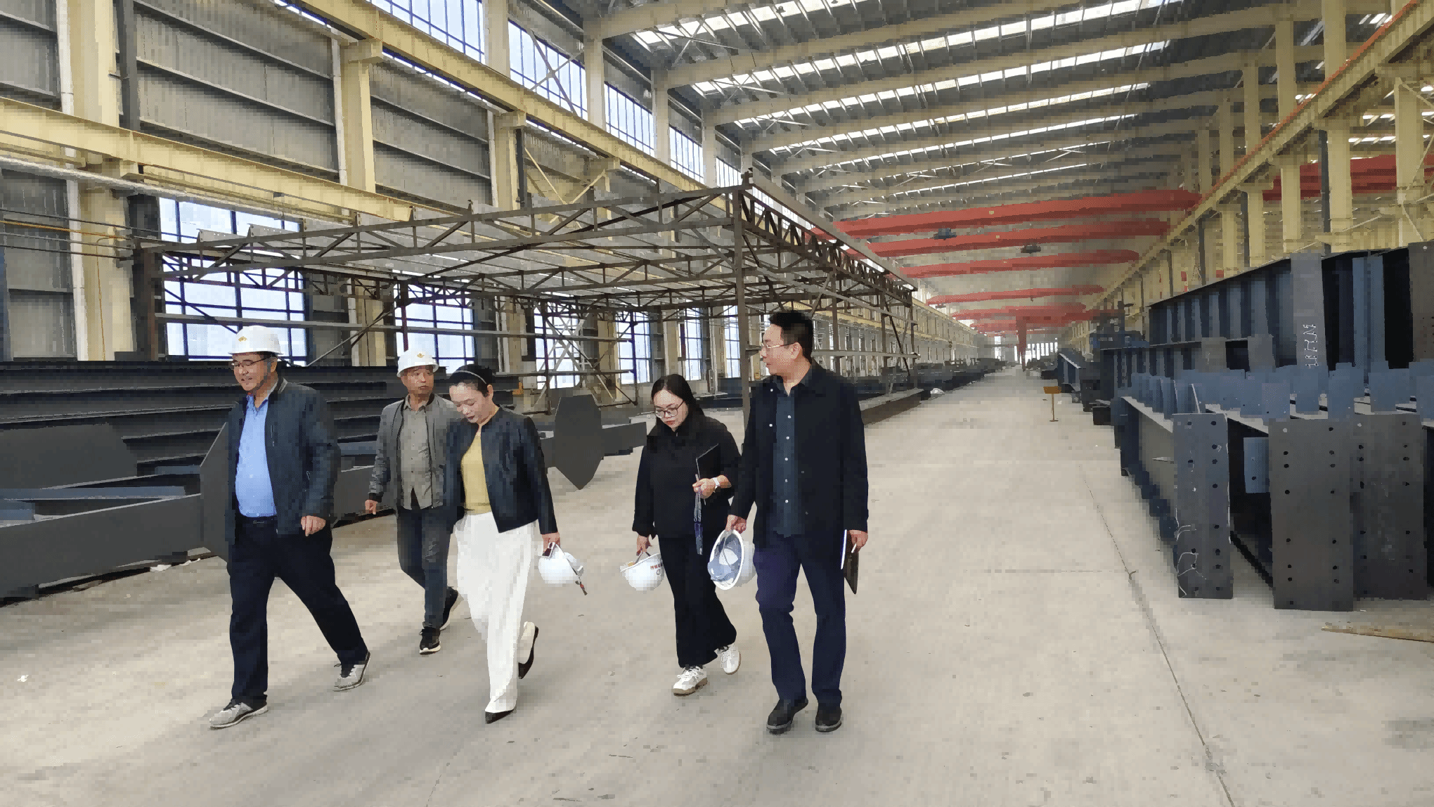 座谈结束后,在韩培玲总经理的陪同下,学院一行深入企业生产厂区,实地参观了钢结构构件加工车间、装配式建筑样板区及智能生产流水线。参观过程中,企业技术负责人详细讲解了钢结构焊接工艺、构件精度检测、新型建材应用等关键环节,展示了公司在绿色制造、智能生产方面的技术优势。吕彪主任不时驻足询问,结合行业发展趋势与学院教学实际,就技术技能人才培养重点与企业方交换意见,为后续课程体系优化积累了实践素材。